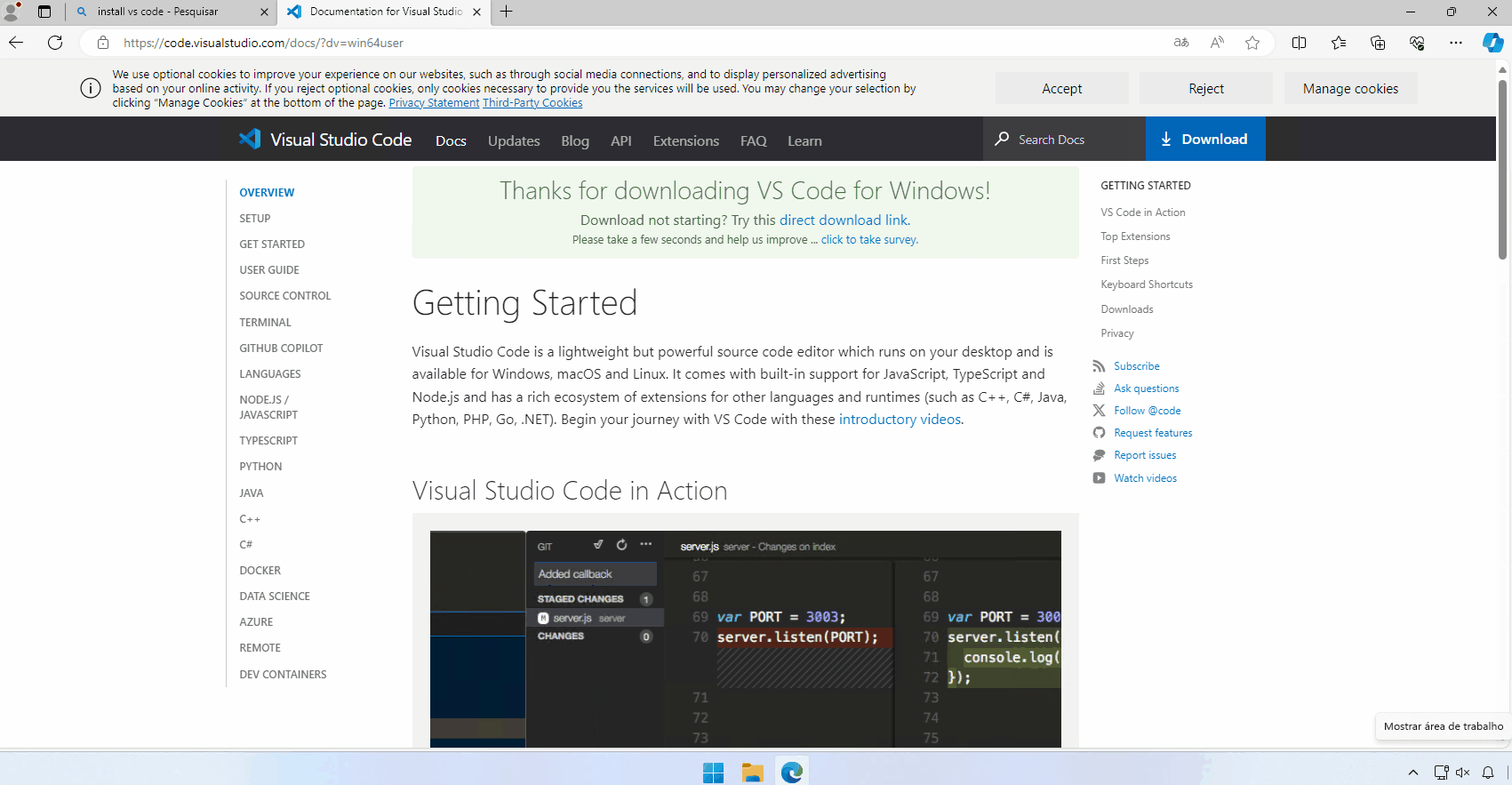 Procure no seu navegador preferido por "instalar VS Code", escolha o seu sistema operacional. No meu caso, estou usando o Windows.